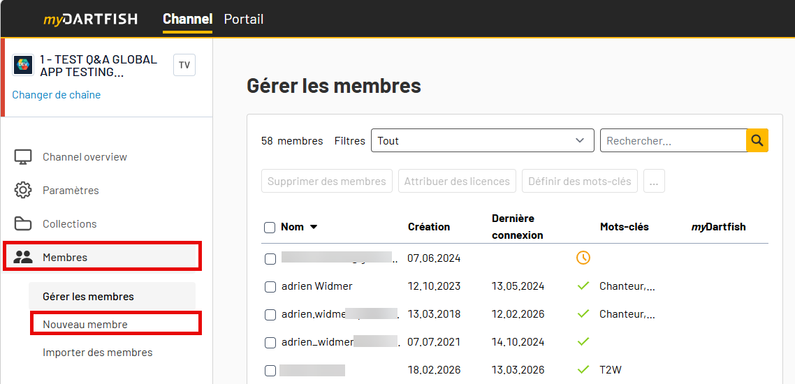 Avant de pouvoir donner un rôle d'administrateur, vous devez d'abord ajouter votre administrateur à la liste des membres de la chaîne. Il ou elle sera déjà membre si vous avez déjà partagé du contenu avec lui ou elle. Sinon, vous devez ajouter manuellement le membre à partir de la page des membres :