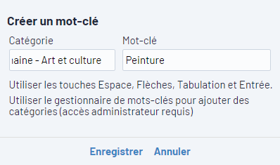 - Créez des nouveaux mots-clés pour les catégories existantes (les catégories sont gérées dans le gestionnaire de mots-clés par l’administrateur). Pour cela cliquez sur « Créer un mot -clé »